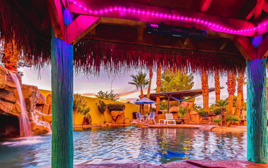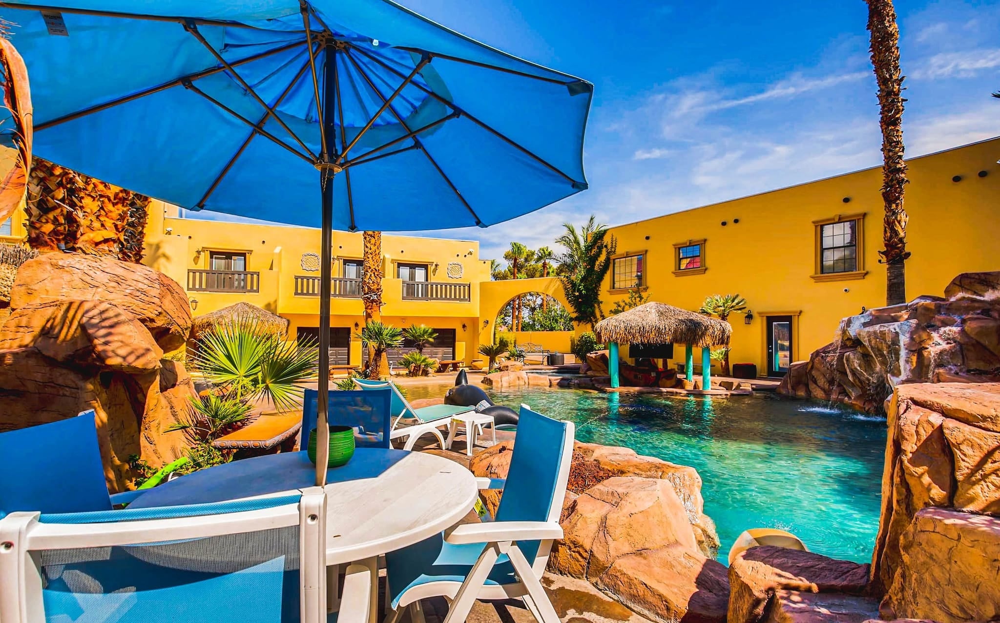 The main resort-style pool has tropical vibes with waterfalls, a grotto, water works, and a swim-up bar, shaded by a Hawaiian Palapa and nearly 40 tall palms. You’ll be questioning whether you’re in Vegas or a tropical island here!